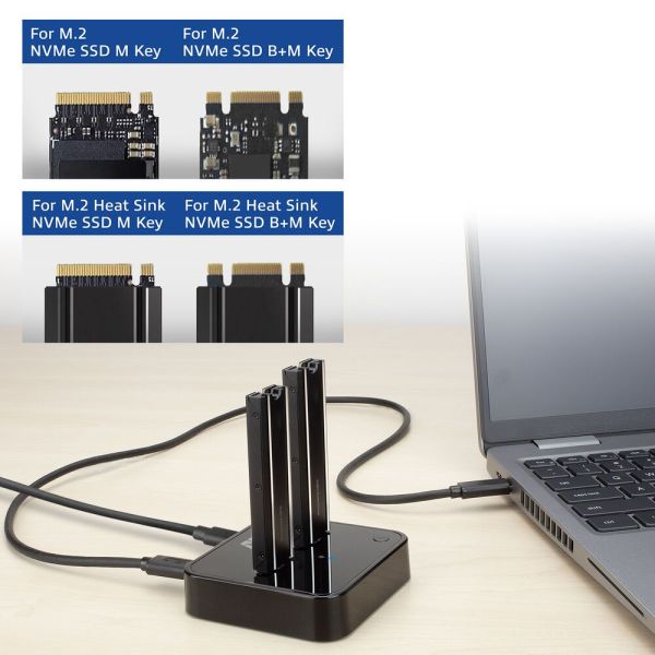 Az AC1502-t úgy tervezték, hogy akár két M.2 NVMe/PCIe SSD-t is csatlakoztathat számítógépéhez vagy laptopjához. A dokkoló kompatibilis az M és a B+M kulcsokkal. Még a hűtőbordás SSD-k is támogatottak.