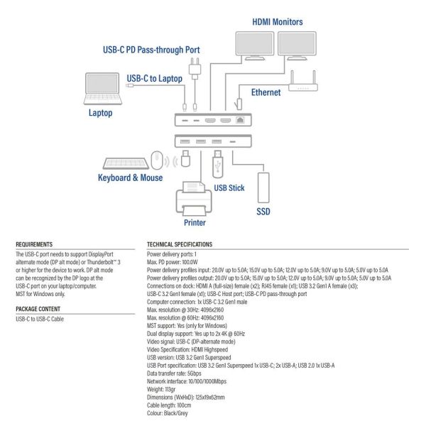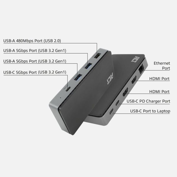 Az AC7093 dokkolóállomás teljes csomagot kínál. Laptopját egyetlen USB-C kábellel teljes munkaállomássá alakíthatja, ha egyetlen USB-C kábelt csatlakoztat laptopjához. Csatlakoztasson akár két 4K monitor (max. felbontás 4096x2160p @ 60Hz) laptopjához a HDMI portokon keresztül a DP Alt Mode 1.4-es verziójával. A dokkolóállomás egy Gigabit LAN hálózati porttal, egy USB-C porttal (5Gbps), két USB-A porttal (5Gbps) és egy USB-A 2.0 porttal (480Mbps) rendelkezik.