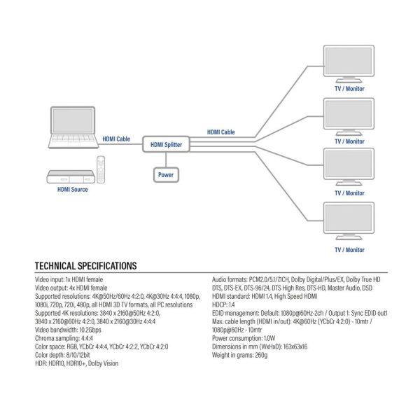 Az AC7832 4K HDMI osztó segítségével egyetlen 4K HDMI jelet jeleníthet meg négy különálló tévére vagy monitorra. Ideális a digitális táblák használatához üzletekben, várótermekben, bárokban és irodákban. A 3840x2160 (4K) @60Hz maximális felbontással rendelkező elosztó támogatja az EDID, a Chroma sampling 4:4:4:4, HDCP 1.4 szabványokat, biztosítva a kiváló minőségű videóátvitelt. Az elosztó külső hálózati adapterrel és levehető rögzítőkonzolokkal rendelkezik.