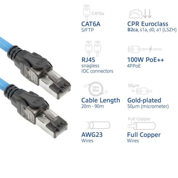 Az S/FTP CAT6A előre gyártott tömör szerelőkábel minden alkalmazáshoz és épülethez alkalmas, beleértve a magas kockázatú környezeteket is, a CPR Euroclass B2ca besorolásának köszönhetően. A kábel támogatja a 4PPoE / PoE++ 100 W-os alkalmazásokat. A szerelőkábel teljes réz, 23AWG vezetékekkel és 50 µ aranyozott RJ45 érintkezőkkel rendelkezik, amelyek IDC-n keresztül vannak csatlakoztatva, és megfelel az ANSI/TIA-568.2-D és az ISO/IEC 11801-1 nemzetközi szabványoknak.