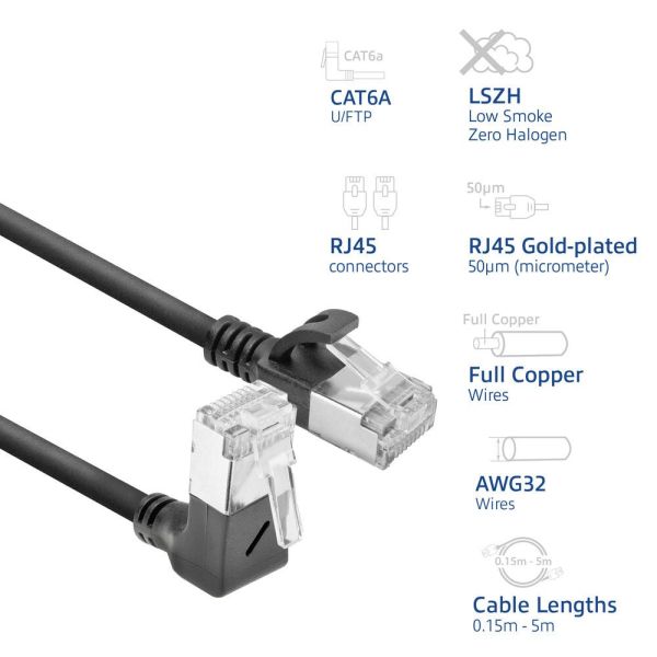A patch kábel egyenes RJ45 csatlakozóval és egy 90°-ban felfelé hajlított RJ45 csatlakozóval rendelkezik. Ideális olyan helyekre, ahol korlátozott a hely, de a hajlítási sugár nem lehet kompromisszum. Például hálózati szekrényekben és berendezések mögött.
