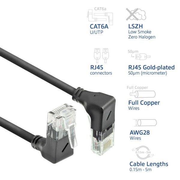 A CAT6A U/UTP slimline adatközponti patch kábelek átmérője kisebb (3,6 mm vs. 5,9 mm) a hagyományos CAT6A patch kábeleknél. A hajlítási sugár kisebb a standard patch kábelekhez képest. Ez jobb légáramlást eredményez a szerverrackben vagy a hálózati szekrényben. A patch kábel 90°-os lefelé hajló RJ45 csatlakozóval és 90°-os felfelé hajló RJ45 csatlakozóval rendelkezik. Ideális olyan helyzetekben, ahol korlátozott a hely, anélkül, hogy a hajlítási sugár csökkenne. Például hálózati szekrényekben és berendezések mögött. Egyenes, 90°-os balra vagy jobbra hajló RJ45 csatlakozóval is kapható.