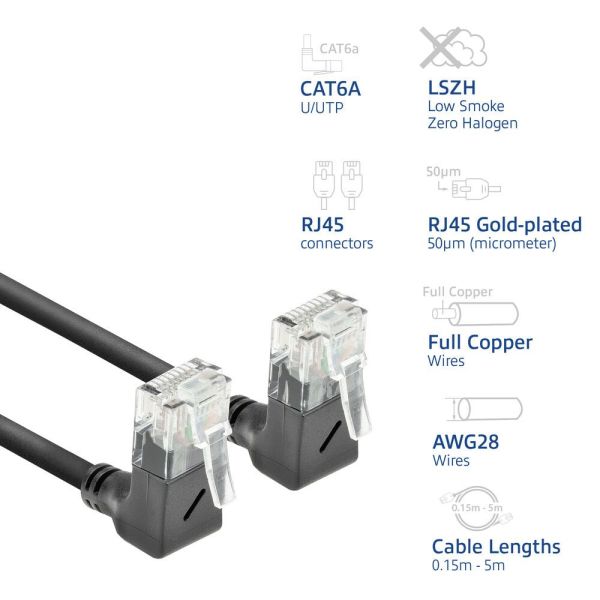 A CAT6A U/UTP slimline adatközponti patch kábelek átmérője kisebb (3,6 mm vs. 5,9 mm) a hagyományos CAT6A patch kábeleknél. A hajlítási sugár kisebb a standard patch kábelekhez képest. Ez jobb légáramlást eredményez a szerverrackben vagy a hálózati szekrényben. A patch kábel két 90°-os szögben felfelé hajló RJ45 csatlakozóval rendelkezik. Ideális olyan helyekre, ahol korlátozott a hely, és nem lehet megnövelni a hajlítási sugarat. Például hálózati szekrényekben és berendezések mögött.