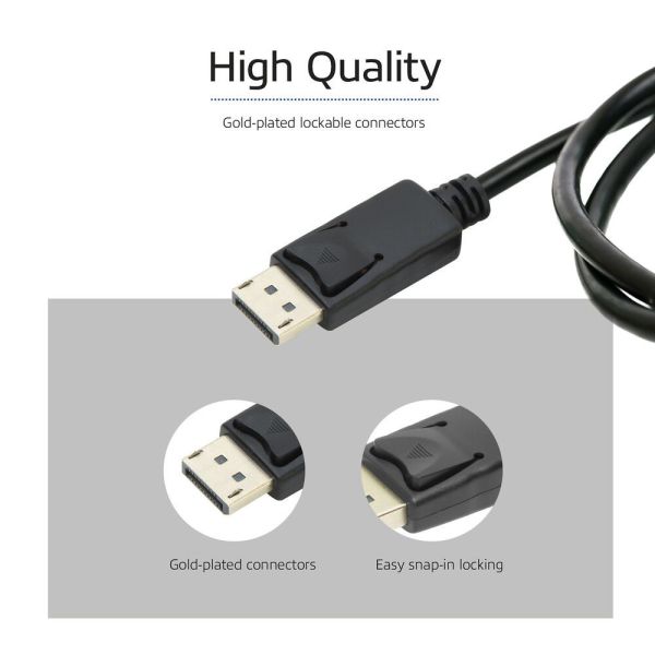 A DisplayPort kábel támogatja a Display Stream Compress (DSC) 1.2-t, az elorehaladó hibajavítást és a 32 inline audio csatornát. A kábel aranyozott zárható csatlakozókkal rendelkezik.