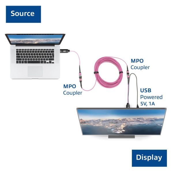 Hosszabbítsa meg a 8K DisplayPort jelet akár 300 méteres távolságra az AK4165 DisplayPort- MTP/MPO adapterkészlettel. Az adapterkészlet a B polaritású OM3/OM4 MTP/MPO kábelekkel való használatra alkalmas. Az adó (TX) és a vevő (RX) egység könnyen cserélhető. Használja ki az optikai szálak előnyeit.