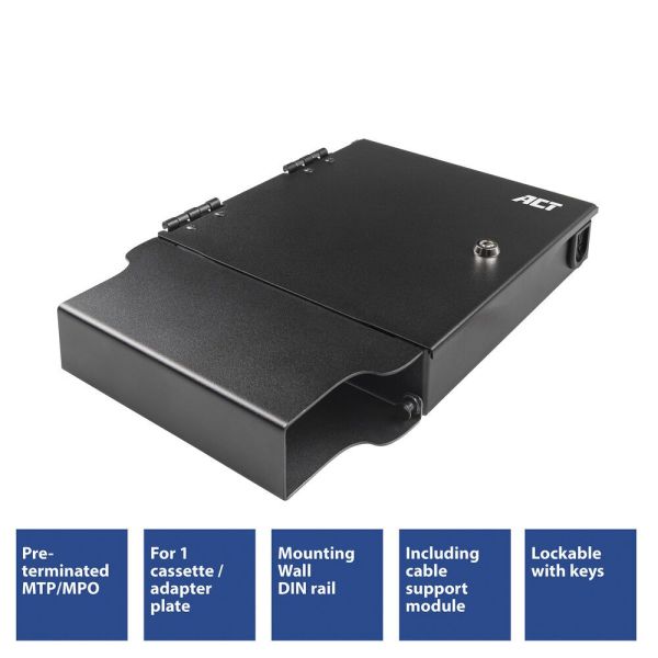 - Teljesen zárható üvegszálas patchbox 1 előre végződő adapterlemezhez vagy MTP/MPO kazettához; kompatibilis az ACT adapterlemezekkel és kazettákkal