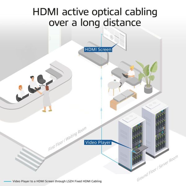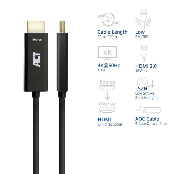Az AOC (Active Optical Cable) kábel gondosan összeállított, rézből és szálból készült, 4K @ 60 Hz átvitelére alkalmas, adatvesztés nélkül, akár 100 m-es távolságig. A kábel sávszélessége 18 Gbps 4:4:4, így alkalmas nagy felbontású videotartalmakhoz.