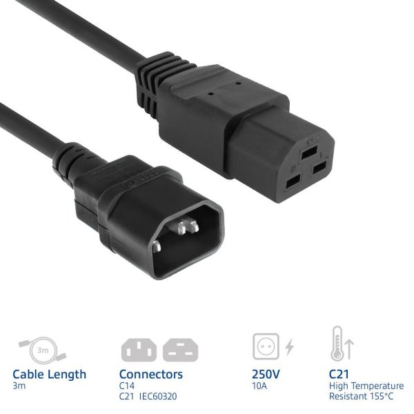 A C14-C21 tápkábel berendezések, például a leggyakrabban használt márkák szervereinek táplálására szolgál. A C21 csatlakozó 155°-ig magas hőmérsékletnek felel meg. Az