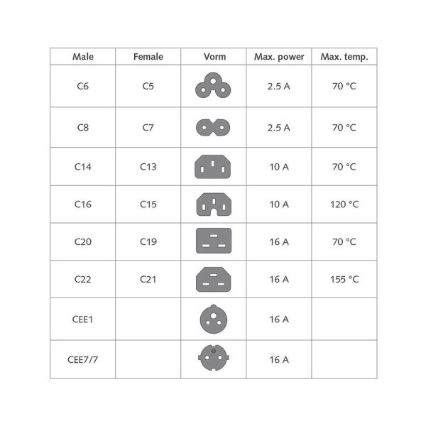 A C20 - C21 tápkábel nagy teljesítményű berendezések, például a leggyakrabban használt márkák szervereinek táplálására szolgál. A C21 csatlakozó 155°-ig magas hőmérsékletnek felel meg. Az