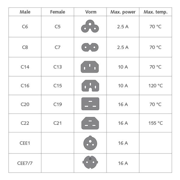 Ezenkívül az ACT számos típusú tápkábelt tartalmaz: CEE 7/7, Euro, UK, USA, olasz, dán, svájci és indiai/dél-afrikai kábelek. Az ACT a következő csatlakozókkal ellátott tápkábeleket szállít: CEE 7/7, IEC60320 C5, C7, C13, C14, C19, C20 és IEC60309 CEE1. Az ACT különböző típusú osztott tápkábeleket és tápkábeleket kínál a következő színekben: fekete, fehér, piros, kék, kék, zöld és sárga.