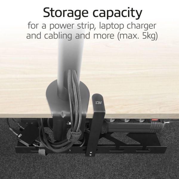 Az AC8378 fém kábelrendezo tálca rendben és tisztán tartja az asztalát, és rendszerezi a kábelezést. A tálca szélessége 40 cm, és elegendo tárolókapacitást biztosít a hosszabbító, a laptop tölto, a kábelek és egyéb eszközök tárolásához. A nyitott szerkezet ideális a szellozéshez és a kábelek elvezetéséhez. És a legjobb: szerelés csavarozás és fúrás nélkül. A tálcát a mellékelt szorítóbilinccsel könnyedén rögzítheti az asztal alá (max. vastagság 50 mm). Az AC8378 szorítóbilinccsel ellátott monitor karral is használható.