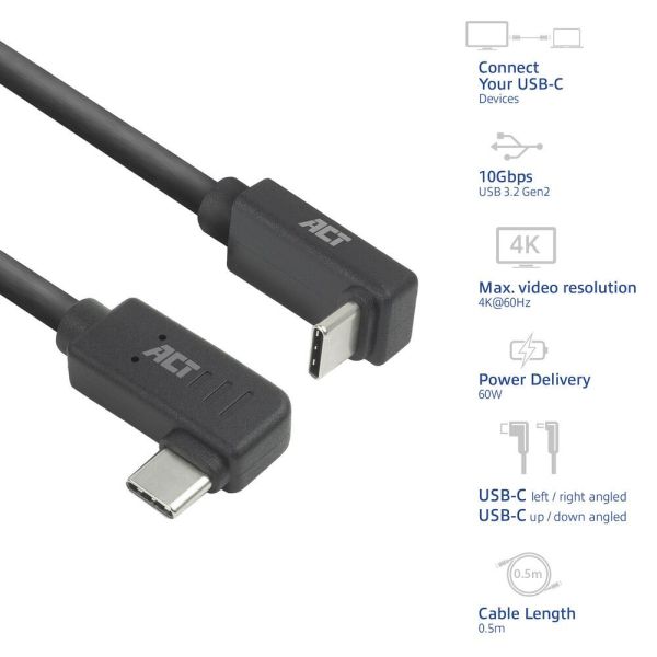Az USB 3.0 Type-C® kábel sokoldalú megoldás USB-C eszközök csatlakoztatásához, kényelmesebb használatot biztosító szögletes csatlakozóval. A maximális adatátviteli sebesség 10 Gbps, így a kábel ideális gyors és megbízható adatátvitelhez. Az USB-C kábel egy 90°-os balra/jobbra hajlított csatlakozóval és egy 90°-os felfelé/lefelé hajlított csatlakozóval rendelkezik, így rugalmasságot biztosít különböző csatlakozási helyzetekben. A kábel támogatja a 60 W-os tápellátást és a DisplayPort Alternate módot, maximális felbontása 4K@60Hz.