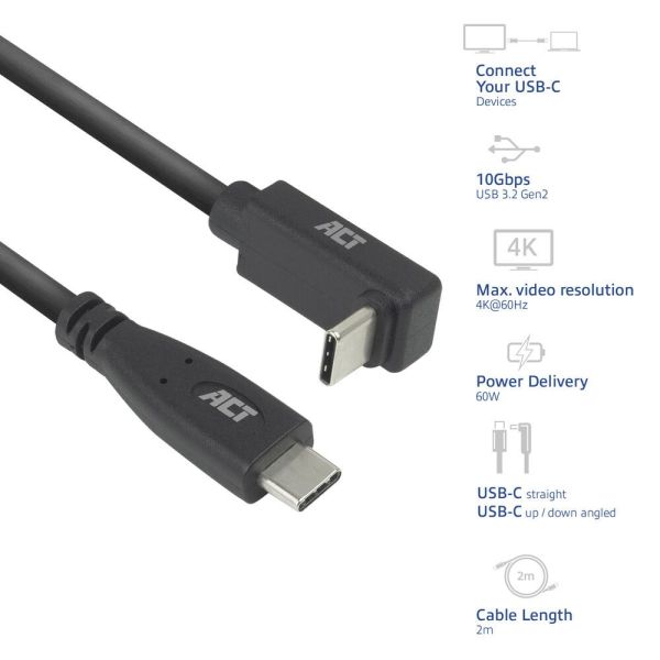Az USB 3.0 Type-C® kábel sokoldalú megoldás USB-C eszközök csatlakoztatásához, kényelmesebb használatot biztosító szögletes csatlakozóval. A maximális adatátviteli sebesség 10 Gbps, így a kábel ideális gyors és megbízható adatátvitelre. Az USB-C kábel egy egyenes és egy 90°-os felfelé/lefelé szögletes csatlakozóval rendelkezik, így rugalmasan használható különböző csatlakozási helyzetekben. A kábel támogatja a 60 W-os tápellátást és a DisplayPort Alternate módot, maximális felbontása 4K@60Hz.