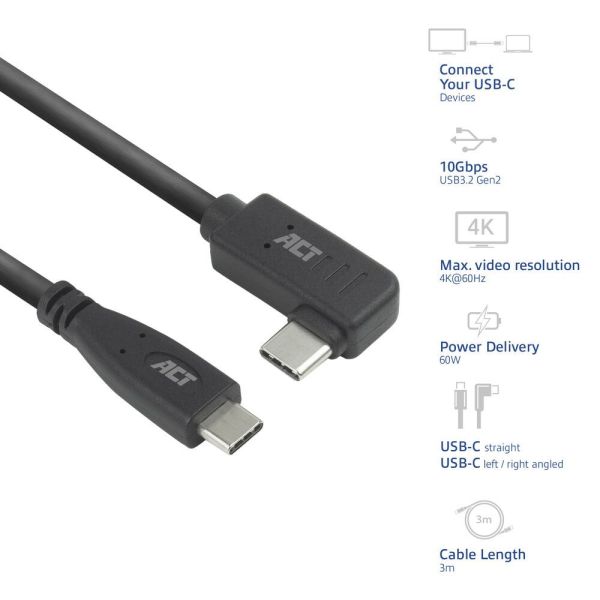 Az USB 3.0 Type-C® kábel sokoldalú megoldás USB-C eszközök csatlakoztatásához, kényelmesebb használatot biztosító szögletes csatlakozóval. A maximális adatátviteli sebesség 10 Gbps, így a kábel ideális gyors és megbízható adatátvitelre. Az USB-C kábel egy egyenes és egy 90°-os balra/jobbra szögletes csatlakozóval rendelkezik, így rugalmasan használható különböző csatlakozási helyzetekben. A kábel támogatja a 60 W-os tápellátást és a DisplayPort Alternate módot, maximális felbontása 4K@60Hz.