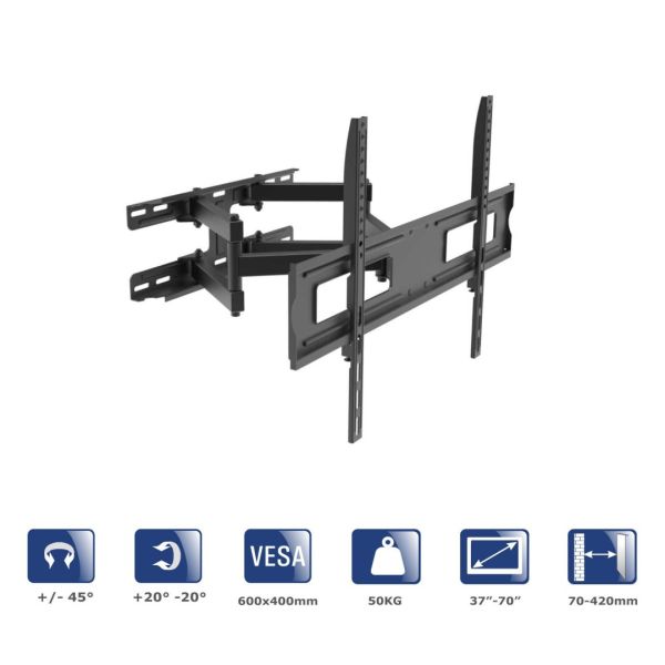 A TV-fali tartó +/- 20 fokos dőlésszögbeállítást és +/- 45 fokos jobbra/balra forgatást tesz lehetővé, így tökéletesen beállíthatja a TV-képernyő helyzetét az egyéni igényeinek megfelelően. Nem számít, hogy hol van a szobában, gyorsan beállíthatja a TV helyzetét a kényelmes nézési környezet érdekében, kiküszöbölve a tükröződést és javítva a látási viszonyokat.