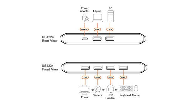 Az US4224 egy 2-portos USB-megosztó kapcsoló, amelyet olyan professzionális és otthoni munkakörnyezetekhez terveztek, ahol elengedhetetlen a perifériák számítógépek közötti megosztása. Az InstaSync™ technológiának köszönhetően akár négy USB-periféria vezérlését is pillanatok alatt átkapcsolhatja két számítógépes rendszer között. Ez gyors és gördülékeny munkamenetet biztosít bármilyen feladat elvégzéséhez, miközben a munkaállomás mindig rendezett, áttekinthető és kezelhető marad.