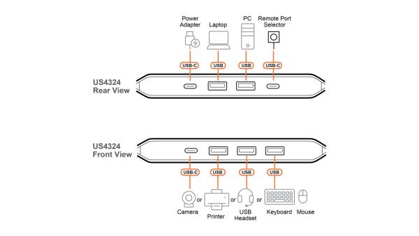 Az US4324 egy 2-portos USB 3.2 Gen 1 megosztó kapcsoló, amelyet úgy terveztek, hogy a modern munkakörnyezetekben szükséges USB-A és USB-C eszközök keverékét is kiszolgálja. Az InstaSync™ technológiának köszönhetően pillanatok alatt könnyedén átkapcsolhatja akár négy periféria vezérlését két számítógép között, így biztosítva, hogy a két számítógépes munkafolyamatok továbbra is gyorsak, hatékonyak és könnyen kezelhetők maradjanak, miközben az asztal felülete is tágas marad.