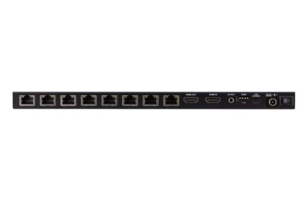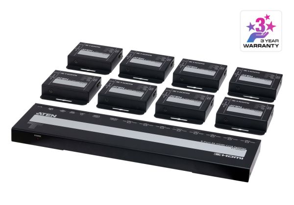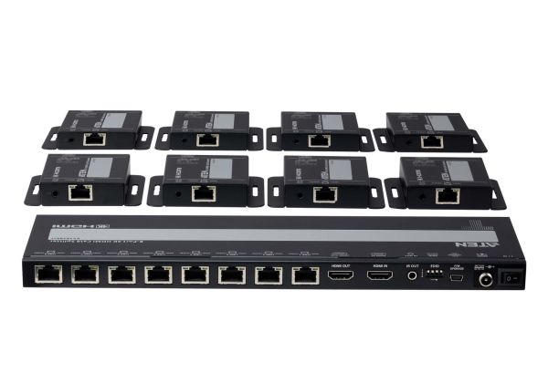 - 1 osztót és 8 vevőt tartalmazó készlet, amely 1 HDMI-forrást egyetlen Cat 6 kábelen keresztül 8, akár 40 m távolságra lévő kijelzőre is továbbíthat