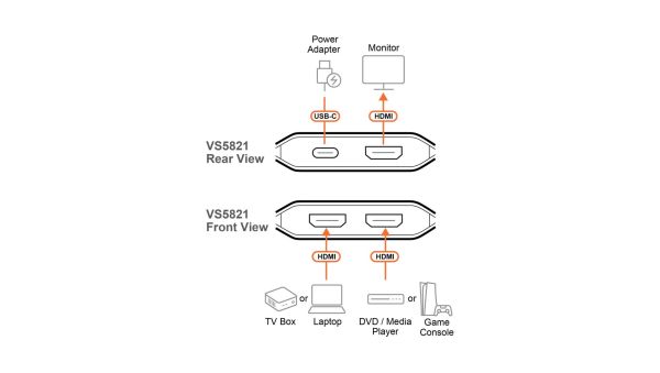Tegye még élvezetesebbé a nézői élményt a VS5821-gyel, egy 2-portos HDMI-kapcsolóval, amelyet úgy terveztek, hogy a legújabb generációs 8K Ultra HD teljesítményt nyújtsa mind a személyes szórakozás, mind a professzionális AV-rendszerek számára. A RapidSync™ technológiának köszönhetően pillanatok alatt élvezheti a két videóforrás közötti gyors AV-váltást egyetlen kijelzőn. A gomb egyszerű megnyomásával elmerülhet az ultraéles részletek, az élénk színek és a mozis hangzás vizuális élményében – mindenféle bonyodalom és többletköltség nélkül, csupán tiszta elégedettséget nyújtva.