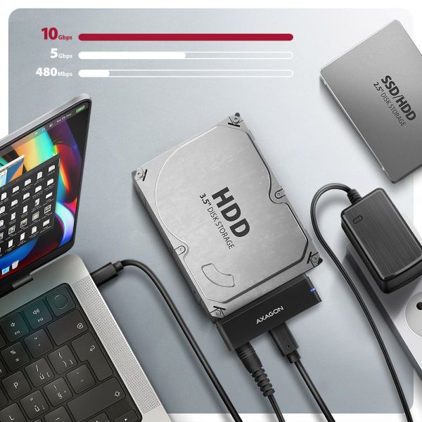 Az AXAGON ADSA-FPX FAST PORT X univerzális adapter USB-C 10Gbps és SATA 6G interfésszel 2.5" / 3.5" SATA merevlemez vagy SSD meghajtó egyszerű csatlakoztatására szolgál. Az akár 10 Gb/s átviteli sebességű, gyors USB 3.2 Gen 2 interfésznek köszönhetően a 2.5"-os SSD-k sebessége nem korlátozott, és körülbelül 20%-kal gyorsabb, mint az USB 3.2 Gen 1 (USB 3.0) adapterek vagy dobozok.