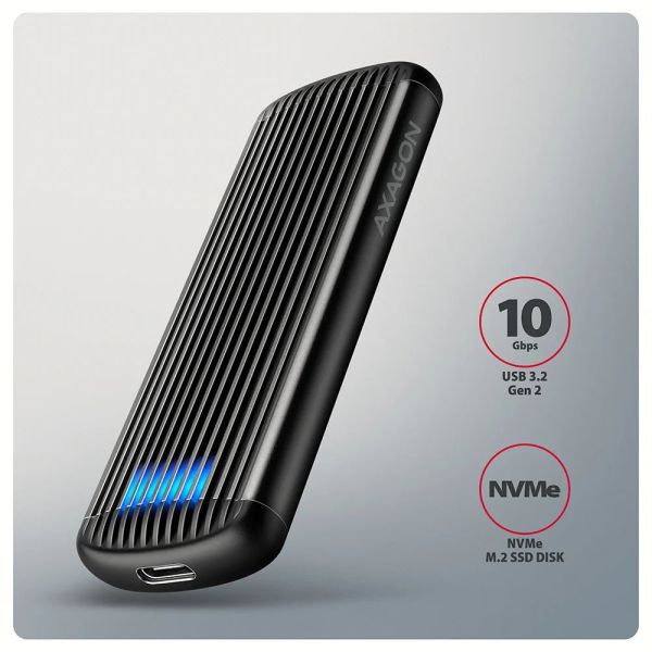 Alumínium külső AXAGON EEM2-SC RIBBED doboz USB 10Gbps interfésszel, M.2 NVMe SSD meghajtókhoz. A stabil és gyors csatlakozást a kétoldalas USB-C csatlakozó biztosítja. A csomagban találsz egy USB-C -> USB-C kábelt, amellyel a dobozt a számítógéphez csatlakoztathatod.