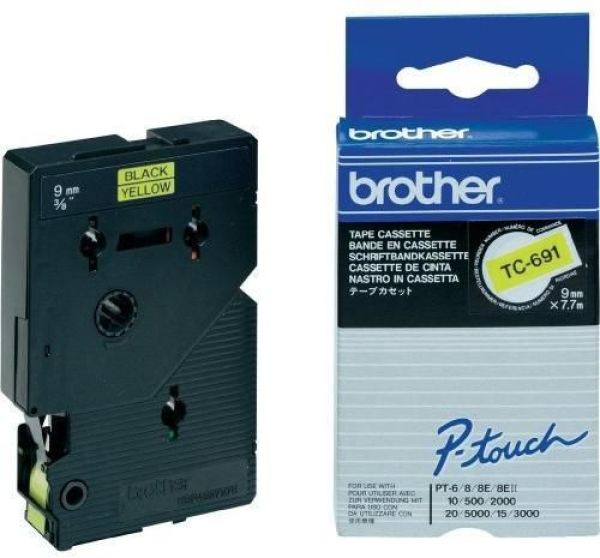 Brother TC-691 laminált P-touch szalag (9mm) Black on Yellow-7,7m