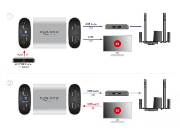 A Delock ezen adaptere felhasználható az audio jel HDMI-átvitelből történő kivonására. Amíg a videojelet egy TV-n vagy monitoron jelenítik meg, az audiojelet a második HDMI-porton keresztül el lehet küldeni egy surround vevőhöz. Ez lehetővé teszi a meglévő AV-vevő vagy hangsáv használatát akkor is, ha nincs megfelelő Ultra-HD kapcsolat.