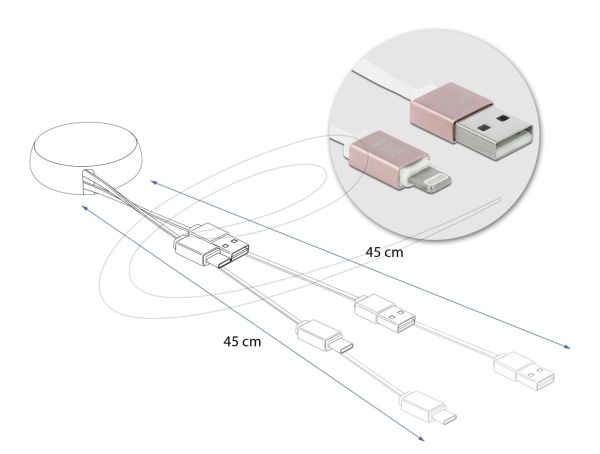 Kis méretének köszönhetően a kábel egy praktikus tars útközben és mindig kéznél van. A tekercselési mechanizmus megakadályozza a kábelek összecsomózódásának veszélyét.