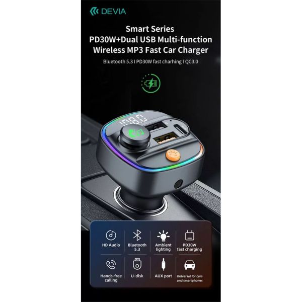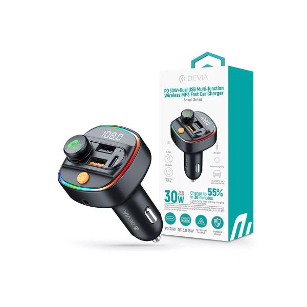 Devia Bluetooth FM-transmitter autós gyorstöltő 30W PD+QC Black