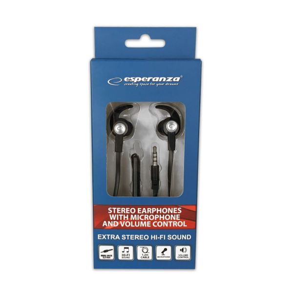 Esperanza fülhallgató mikrofonnal és hangerőszabályzóval, kompatibilis audio lejátszókkal, MP3/MP4 eszközökkel, számítógépekkel és más, szabványos hangkimenettel rendelkező eszközökkel. Ezek a fejhallgatók tartós, zajszigetelő gumifülkével rendelkeznek, amelyek könnyen alkalmazkodnak a fül alakjához. Emellett fokozott basszust biztosítanak a gazdagabb hallgatási élmény érdekében.