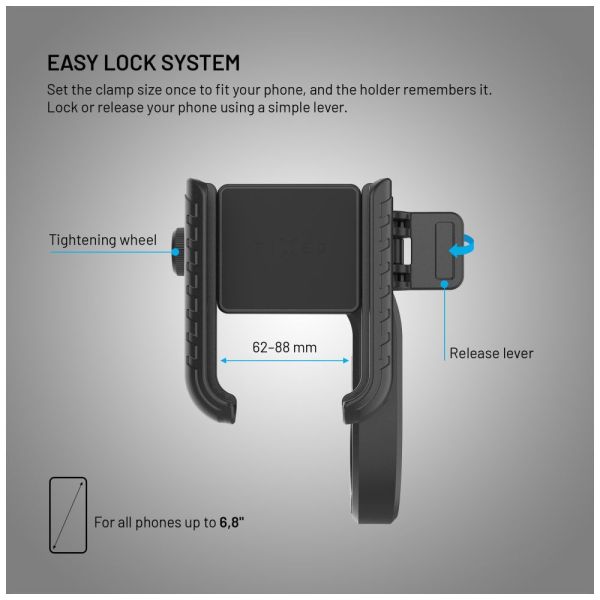 A FIXED Bikee Plus Vista univerzális tartó ideális megoldás a telefon biztonságos használatához kerékpározás vagy robogózás közben. A tartós, keményített műanyagból készült, szilikon párnázással ellátott tartó biztonságosan rögzíti a készüléket a 17-32 mm átmérőjű kormányhoz, és megvédi azt az ütésektől és sérülésektől még nehéz terepen is. A telefont egyszerűen behelyezheti a tartóba, a tartó oldalait enyhén a telefonhoz nyomja, majd a bal oldali kerékkel beállíthatja a kívánt szélességet. Ez akár 6,8" képátlójú telefonokhoz is beállítható. A szélesség beállítása után az oldalsó karral rögzíthető - ez biztosítja, hogy a telefon szilárdan és biztonságosan rögzüljön. Ezt követően a működtetés egyszerű és gyors, csak lazítsa meg az oldalsó kart, helyezze be vagy vegye ki a telefont, majd rögzítse újra. Az így beállított tartó szélessége mindaddig fix marad, amíg Ön maga nem állítja be. A tartó lábának meghosszabbított kialakításának köszönhetően a telefon optimálisan a kormány előtt van középen, ami természetes kilátást biztosít a kijelzőre, akár a navigációt, akár a teljesítménystatisztikákat nézi. Az ideális betekintési szöget a forgatható csuklóval állíthatod be. A FIXED Bikee Plus Vista tartónak köszönhetően teljes mértékben élvezheti a városban vagy a természetben való tekerést úgy, hogy telefonja mindig biztonságban van.
