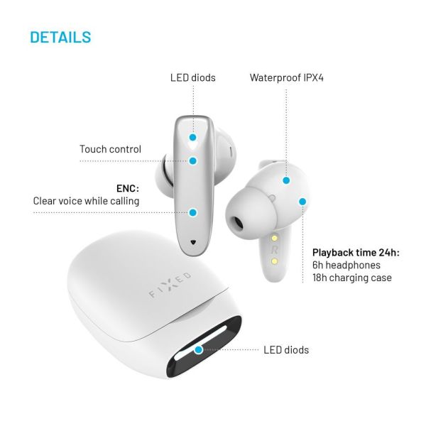 - hosszú, akár 24 órás akkumulátor-üzemidő (6 óra fejhallgatóval + 18 óra töltőtokkal)