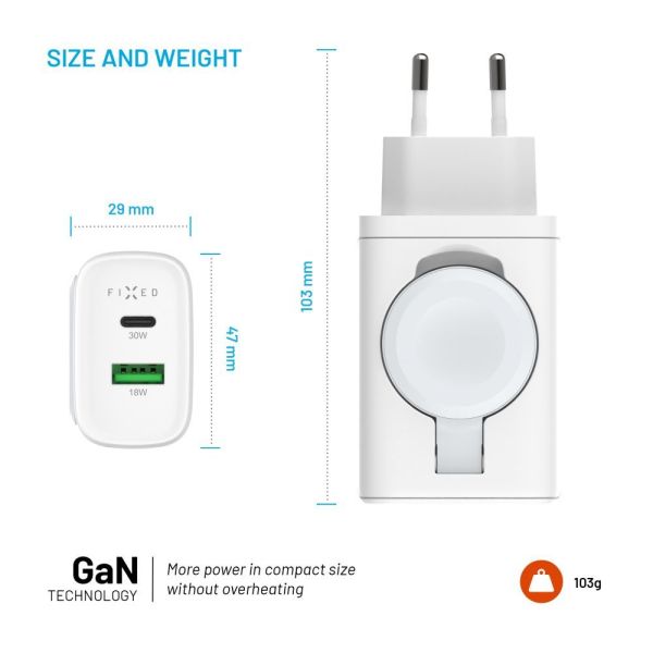 A kompakt, akár 33 W teljesítményű FIXED hálózati töltő a töltőportok és az Apple Watch integrált töltőjének praktikus kombinációja. Az USB-C és USB-A portokkal egyszerűen és gyorsan töltheti telefonját, táblagépét vagy más elektronikai eszközeit. A két portnak köszönhetően egyszerre két eszköz tölthető. Az Apple Watch kényelmes töltéséhez az adapter felhajtható felülettel rendelkezik, amely mágneses csatlakozóval rendelkezik az óra pontos centrírozásához és gyors töltéséhez további kábelek nélkül. A töltő GaN technológiát használ, amely nagyobb teljesítményt és töltési hatékonyságot biztosít a kompakt méretek megtartása mellett. A töltő minimalista és vékony teste nem foglal helyet, könnyen elfér bármilyen táskában, így ideális választás a gyors töltéshez, akár otthon, akár útközben.