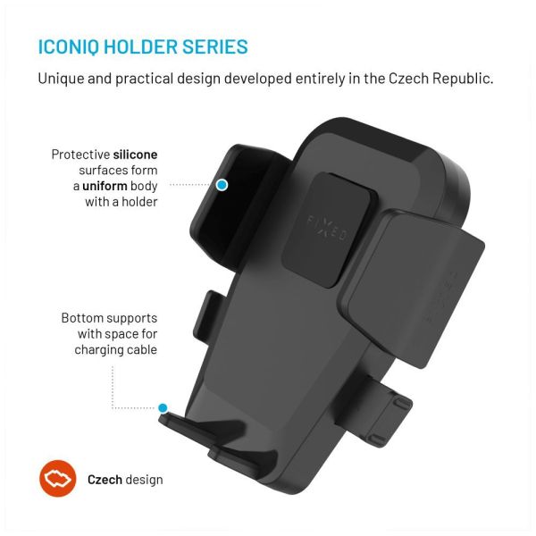A FIXED Iconiq Flex XL univerzális autós tartó a Push and grip gyorskioldó rendszerrel biztonságos és egyszerű, egy kézzel is kezelhető telefonrögzítést kínál. A teljesen Csehországban kifejlesztett tartó csendes és sima mechanizmust kínál minimalista funkcionális dizájnnal kombinálva. Csak enyhén nyomja a telefont a tartó felületére, és az oldalsó rögzítő automatikusan alkalmazkodik a telefon méretéhez, legfeljebb 8,3 cm szélességig. Egyetlen nyomással ugyanilyen gyorsan kioldja a telefont. A rögzített telefon stabilitását alulról fazettált támaszok biztosítják, amelyek nem akadályozzák a töltőcsatlakozóhoz való hozzáférést. A tartó teste edzett műanyag és védő szilikon elemek kombinációja, amelyek egyetlen egységet alkotnak. A tartó hajlékony karja a tapadókorong segítségével a szélvédőre vagy a műszerfalra helyezhető. A tapadókorong ellenáll minden ütésnek, és többszöri rögzítés után sem veszíti el erős tapadását. A 29 cm hosszú kar biztosítja az ideális betekintési szöget, amely tetszés szerint hajlítható vagy egy kiegészítő fogantyúval erős 3M szalaggal rögzíthető. A kábelrendezést a tartó hátoldalán található levehető fogantyúk könnyítik meg. A FIXED Iconiq Flex XL tartóval gondtalanul élvezhet minden utazást.