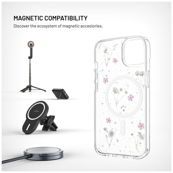 A FIXED MagBloom védőburkolat stílusos és praktikus kiegészítővé varázsolja telefonját, amely megbízható védelmet nyújt a mindennapi használat során. Az edzett polikarbonátból készült tok hátlapja véd a karcolásoktól, míg a rugalmas TPU-ból készült oldalak elnyelik az ütéseket és az eséseket. A legnagyobb figyelmet azonban az eredeti dizájn kelti - valódi szárított virágok vannak közvetlenül a hátlapba préselve, amelyek megőrzik természetes formájukat és színüket. Ez minden egyes borítót eredetivé tesz. Az átlátszó anyag természetesen ellenáll a sárgulásnak is, a kamera és a kijelző területén lévő enyhén megemelt élek pedig megvédik azokat a felülettel való érintkezéstől és az esetleges karcolásoktól. A MagSafe mágnesek is közvetlenül a borító testébe vannak préselve, így nem állnak ki, és nem áll fenn a kihullásuk veszélye. Megbízhatóan rögzülnek a töltőkhöz és más mágneses tartozékokhoz. A FIXED MagBloom minden egyes darabjával eredeti virágos megjelenést kap a megbízható általános védelem mellett.