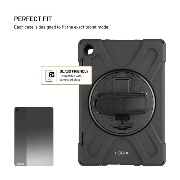 Az extra tartós FIXED Rugged Tab tokot a táblagép maximális védelmére terveztük, amely könnyedén ellenáll a leejtéseknek, ütéseknek és a mindennapi kopásnak. A sarkok és oldalak megerősített kialakítása megbízhatóan elnyeli az ütéseket, míg a kijelző megemelt szélei védelmet nyújtanak a sérülések ellen, ha a készüléket lefelé fordítva helyezed. A belső szilikon párnázás további ütéscsillapítást és védelmet biztosít a táblagépnek. A tok hátoldalán egy forgatható fogantyú található, amely jelentősen megkönnyíti a táblagép tartását és kezelését. A fogantyú 360°-ban elforgatható, így könnyedén beállíthatja bármilyen pozícióba, a tépőzár segítségével pedig a fogantyú pántját bármilyen kézmérethez igazíthatja. A fogantyú praktikus állványként is szolgál - csak hajtsa ki, és a táblagép stabilan vízszintes helyzetbe kerül, ami ideális videók nézéséhez, videohívásokhoz vagy menet közbeni munkához. A csomag tartalmaz egy levehető és állítható pántot is, amely a tok bármelyik sarkához rögzíthető, így kényelmesen hordozhatja a vállán vagy a nyakán. A tok tolltartó résszel, csatlakozóvédelemmel is rendelkezik, és precíz kidolgozásának köszönhetően teljes mértékben kompatibilis a védőüveggel ellátott táblagépekkel. A FIXED Rugged Tab maximális védelmet nyújt táblagépének, akár építkezésen, terepen vagy útközben.
