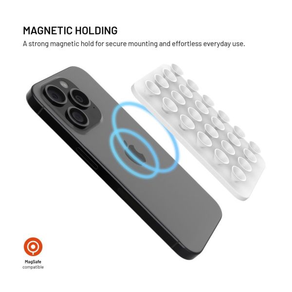 A FIXED MagMate szilikonos tapadókorongos tartó MagSafe rögzítéssel egyszerű módot biztosít arra, hogy a telefonodat szem előtt tartsd anélkül, hogy a kezedben kellene tartanod. A tapadókorongos oldal szilárdan tartja a tükör, üveg vagy más sima felület, míg a MagSafe mágnes biztonságosan rögzíti az iPhone 12 és újabb iPhone készülékeket vagy bármely MagSafe tokkal ellátott telefont. Így könnyedén készíthetsz fényképeket, videókat, vagy szem előtt tarthatod a telefon képernyőjét főzés, edzés vagy sminkelés közben. Az öntapadós alternatívákkal ellentétben nem rögzül szilárdan a telefonhoz, de a mágneses rögzítésnek köszönhetően bármikor könnyedén eltávolítható. A prémium minőségű Liquid szilikonból készült felület mosható, tartós és ugyanakkor kellemes tapintású. Az ultravékony, 7 mm-es kialakításnak köszönhetően a tartó beleolvad a telefonba, és alig növeli annak méretét. A FIXED MagMate minimalista megoldása megkönnyíti a telefon mindennapos használatát, bárhol is legyen.