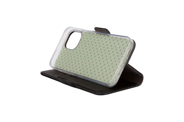 Az elülső rész kinyitása után egy nagyobb zseb található a bankjegyek számára és három kisebb rekesz, amelyekben a hitelkártyák tárolhatók. Mágneses zár biztosítja a tok biztonságos zárását. A nyitott tok vízszintesen állvány helyzetbe állítható a kényelmes videózás érdekében.
