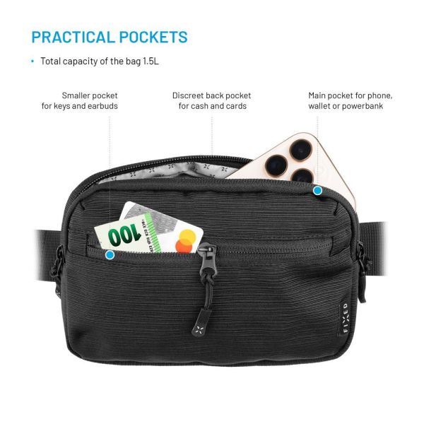 A stílusos FIXED Camino Belt deréktáska egy praktikus kiegészítő, amelyben mindig kéznél lesz minden, amire szüksége van. Olyan ökológiai anyagból készült, amely PET-palackok újrahasznosításával jön létre, így könnyűségével, tartósságával tűnik ki, és környezetbarát is. A táska 1,5 literes térfogatával rengeteg helyet kínál - a fő cipzáras zsebben biztonságosan elfér a mobiltelefon, a pénztárca és egyéb szükséges dolgok, míg az elülső és hátsó két kisebb zseb ideális más apróságok számára. Az állítható pántnak köszönhetően a derekad körül vagy kényelmesen keresztben is hordhatod. A mágneses zárral ellátott fémcsat biztosítja, hogy még igényesebb tevékenységek során sem nyílik ki véletlenül, és a holmijai biztonságban maradnak. A FIXED Camino Belt deréktáska remek társ kirándulásokhoz, fesztiválokhoz és városi sétákhoz.