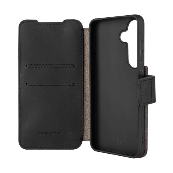 FIXED ProFit oldalra nyíló telefontok kézzel varrott valódi bőr, Samsung Galaxy S25 készülékhez, fekete