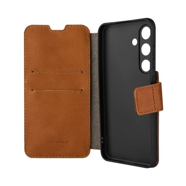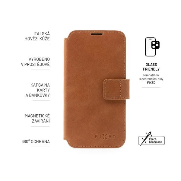 A valódi marhabőrből kézzel készített FIXED ProFit tok elegáns és praktikus kiegészítő mobiltelefonja számára. Megvédi telefonját az esetleges sérülésektől, miközben elegendő helyet biztosít dokumentumainak, hitelkártyájának és néhány bankjegynek. A ProFit tokot pontosan a telefon modelljéhez tervezték, a belső szilikon tálca lemásolja a készülék formáját, és szabad hozzáférést biztosít az összes vezérlőgombhoz, csatlakozóhoz és a hátoldalon lévő kamerához. Az elülső, csuklós rész biztonságosan védi a kijelzőt, és mágneses zárással rögzíthető. A tok kinyitása után a belső oldalon két zseb található a hitelkártyák számára, valamint egy nagyobb bankjegyzseb.