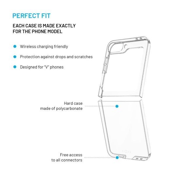 A FIXED PURE hatékony, az Ön flip-telefonjára szabott védelmet jelent. Az edzett polikarbonátból készült borítás tökéletesen illeszkedik a telefon alakjához, ami lehetővé teszi, hogy a készülék mindkét része könnyen lehajtható és teljesen lezárható legyen. A telefon így nemcsak az ütésektől és a szennyeződések bejutásától van teljesen védve, hanem megakadályozza a telefon ízületének kopását is. A kamera, a hangszórók és a töltőcsatlakozó számára kivágásokkal ellátott, precízen megformázott borítás biztosítja a problémamentes használatot, miközben nem akadályozza a vezeték nélküli töltést. Az UV-sárgulásgátló kezelésnek köszönhetően a borítás továbbra is tiszta megjelenésű, és a 100%-os átlátszóságnak köszönhetően nem takarja el a telefon dizájnját. A FIXED Pure kompatibilis az összes FIXED edzett üveggel.