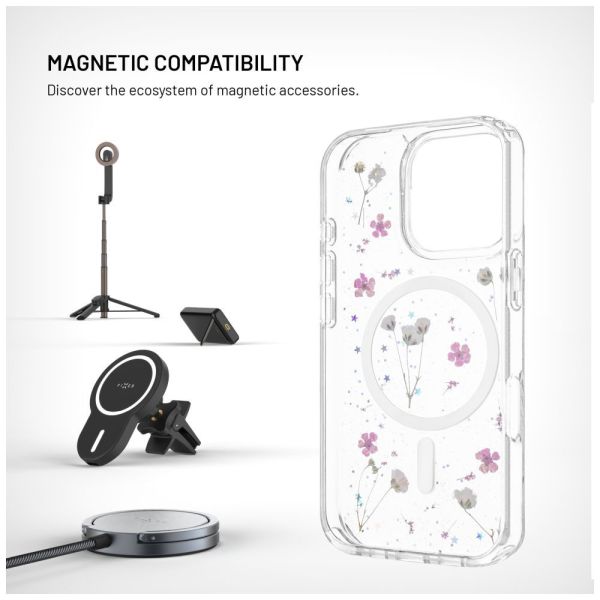 A FIXED MagBloom védőtok stílusos és praktikus kiegészítővé varázsolja telefonját, amely megbízható védelmet nyújt a mindennapi használat során. A keményített polikarbonátból készült tok hátsó része megvédi a karcolásoktól, míg a rugalmas TPU-ból készült oldalak elnyelik az ütéseket és a zuhanásokat. De a legnagyobb figyelmet az eredeti dizájn vonzza: valódi szárított virágok vannak közvetlenül a hátlapba préselve, amelyek megőrzik természetes alakjukat és színüket. Ez teszi minden tokot eredetivé. Az átlátszó anyag természetesen ellenáll a sárgulásnak, a kamera és a kijelző területén kissé megemelt élek pedig megvédik őket a felülettel való érintkezéstől és az esetleges karcolásoktól. A MagSafe mágnesek is közvetlenül a tok testébe vannak préselve, így nem nyúlnak ki, és nem áll fenn a kiesésük veszélye. Megbízhatóan rögzülnek a töltőkhöz és más mágneses kiegészítőkhöz. Minden FIXED MagBloom termékkel eredeti virágos megjelenést és megbízható általános védelmet kap.
