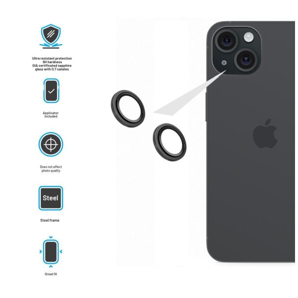 A fémkerettel rögzített, extra vékony zafírüveg megbízható védelmet nyújt a fényképezőgép lencséinek. A 9H keménységű zafírüveg rendkívül ellenálló a karcolásokkal szemben, így a készített fényképek megőrzik minőségüket és élességüket. A különálló lencsék az adott telefontípusra szabottan készülnek, és pontosan lemásolják a kamera formáját. A telefon színének megfelelő színű fémkeret megvédi az üveget a repedéstől, nem takarja el a vakut, és nem zavarja a kamera lencséjét. A lencsevédő a legtöbb, a piacon kapható borítóval és tokkal együtt használható. A diaképek egyszerű felragasztásához egy applikációs keretet tartalmaz a csomag.