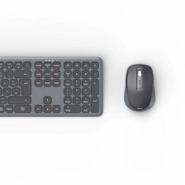 - Irodai billentyűzetet és optikai 6 gombos egeret tartalmazó készlet számítógépek, okostelefonok és táblagépek vezeték nélküli vezérléséhez Bluetooth-on vagy rádió frekvencián keresztül, az USB-A vevőegységgel kombinálva