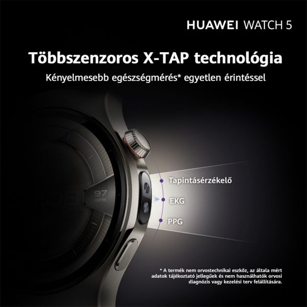 Az első okosóra, amely támogatja a valós idejű, ujjbeggyel végzett SpO2 mérést. Egyszerűen érintsd meg a HUAWEI X-TAP szenzort, és 10 másodpercen belül megkaphatod a hozzávetőleges véroxigén-értéket. A szenzor erőteljes jelet használ, amely az ujjbegyek gazdag érrendszerére épül.