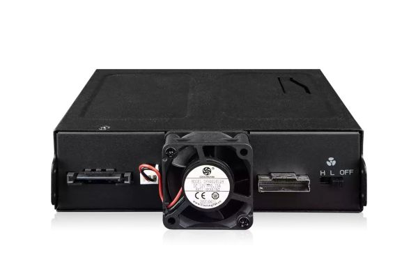 A beépített 40 mm x 20 mm-es hátsó hűtőventilátor hatékonyan elszívja az U.2/U.3 SSD-k által generált hőt a burkolatban intelligensen elhelyezett szellőzőnyílásokon keresztül. Az U.2/U.3 meghajtók terhelésének intenzitásától függően a felhasználó három ventilátorbeállítás közül választhat: Hi (Magas), Low (Alacsony) és Off (Ki).