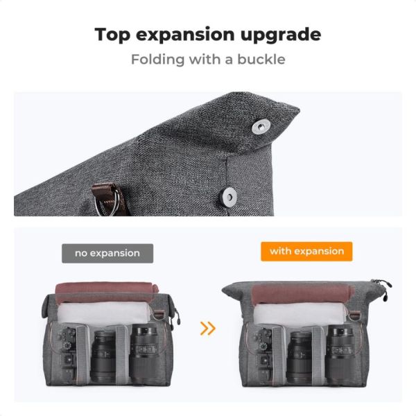 【Customizable Space & Top Expansion】A fényképezőgép táska 2 kivehető párnázott elválasztóval rendelkezik a szabadon testreszabható belső szervezéshez, beállíthatja a helyet, hogy tökéletesen illeszkedjen a felszereléséhez. A kamera crossbody táska felső helye mágneses csattal bővíthető, hogy több tárgyat tarthasson.