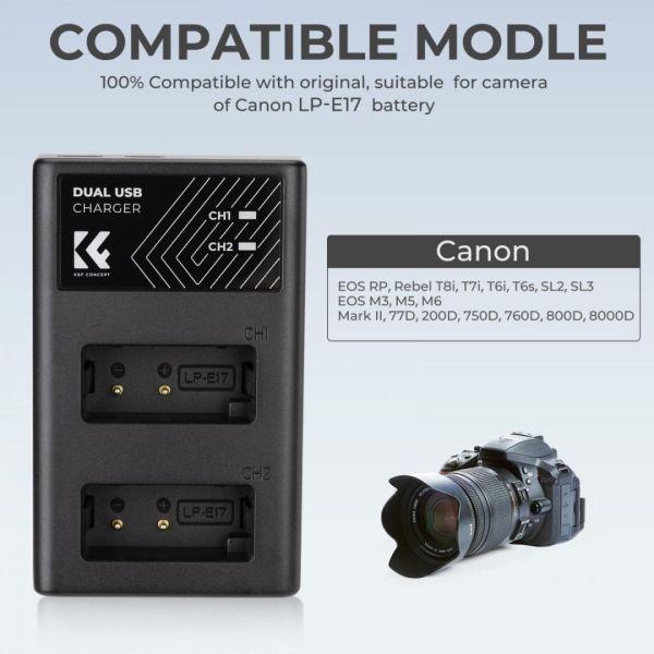 Kompatibilitás: Az eszköz olyan gyakran használt Type-C és Micro USB interfészeket használ, ami kényelmesebb használatot tesz lehetővé. Kompatibilis az LP-E17 fényképezőgép akkumulátorokkal és a felsorolt fényképezőgép modellekkel: Canon EOS RP, Rebel T8i, T7i, T6i, T6s, SL2, SL3, EOS M3, M5, M6 Mark II, 77D, 200D, 750D, 760D, 800D, 8000D