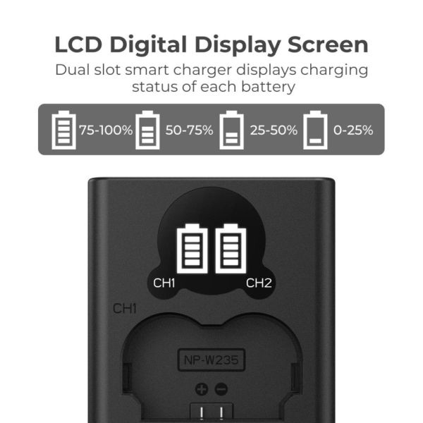 A K&F Concept NO-W235 típusú dupla akkumulátortöltő tökéletes megoldás a Fujifilm MP-W235 (NP-W235 kompatibilis) akkumulátorokat használó fényképezőgépekhez. Kompakt, könnyen hordozható kialakításának, USB-C csatlakozásának és jól látható LCD kijelzőjének köszönhetően ideális társ stúdióban és terepen egyaránt.